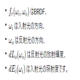 BRDF(Bidirectional Reflectance Distribution Function): BRDFは、表面の反射率を表す関数です。物体が入射した光をどのように反射するかを記述します。BRDFは入射光の方向と反射光の方向を考慮して、それらの間の関係を定義します。これは主に非透明な物体の表面の反射に対して使用 されます。