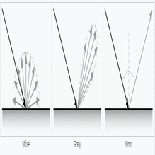 さまざまな光と表面の相互作用をモデル化するために使用できる3つの要素成分[8]。入射光線は黒で、BRDFによってモデル化された反射光線は灰色で示されている。 Lambertianモデル。完全な拡散(マット)表面を一定のBRDFで表す。 Lommel-Seeliger、月および火星の反射。 Phong反射率モデル。プラスチックのような鏡面性に似た現象学的モデル[9]。 Blinn-Phongモデル。Phongに似ているが、特定の量を補間することができ、計算オーバーヘッドを減らすことができる[10]。 Torrance-Sparrowモデル。表面を完全な鏡面マイクロファセットの分布として表現する一般的なモデル[11]。 Cook-Torranceモデル。波長を考慮した鏡面-マイクロファセットモデル(Torrance-Sparrow)であり、その結果カラーシフトも考慮されている[12]。 Wardモデル。(表面の法線に加えて)表面の接線方向に依存する楕円ガウス分布関数を持つスペキュラー-マイクロファセットモデル[13]。 Oren-Nayarモデル。「有向拡散」マイクロファセットモデルで、(鏡面ではなく)完全に拡散したマイクロファセットを持つ[14]。 Ashikhmin-Shirleyモデル。鏡面下の拡散基板とともに、異方性反射率を許容する[15]。 HTSG(He、Torrance、Sillion、Greenberg):包括的な物理ベースモデル[16]。 Fitted Lafortune モデル。複数の鏡面ローブを持つ Phong の一般化で、測定データのパラメトリッ クフィットを目的としている[17]。 解析格子BRDF近似のためのLebedevモデル[18]。 ABgモデル[19][20]。 K相関(ABC)モデル[21]。