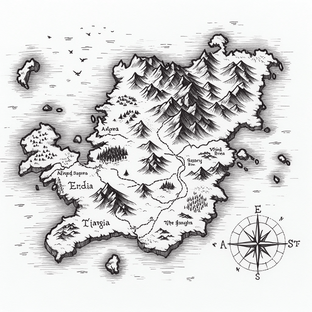 A simple hand-drawn map of a fantasy continent, styled with minimalistic pen drawings. The map features basic geographical elements like mountains, rivers, and forests, and includes a few small villages. The design omits detailed embellishments and focuses on clear, clean lines with a compass rose and basic labels for locations in a simple font. The overall appearance is neat and uncluttered, drawn on a plain white background.