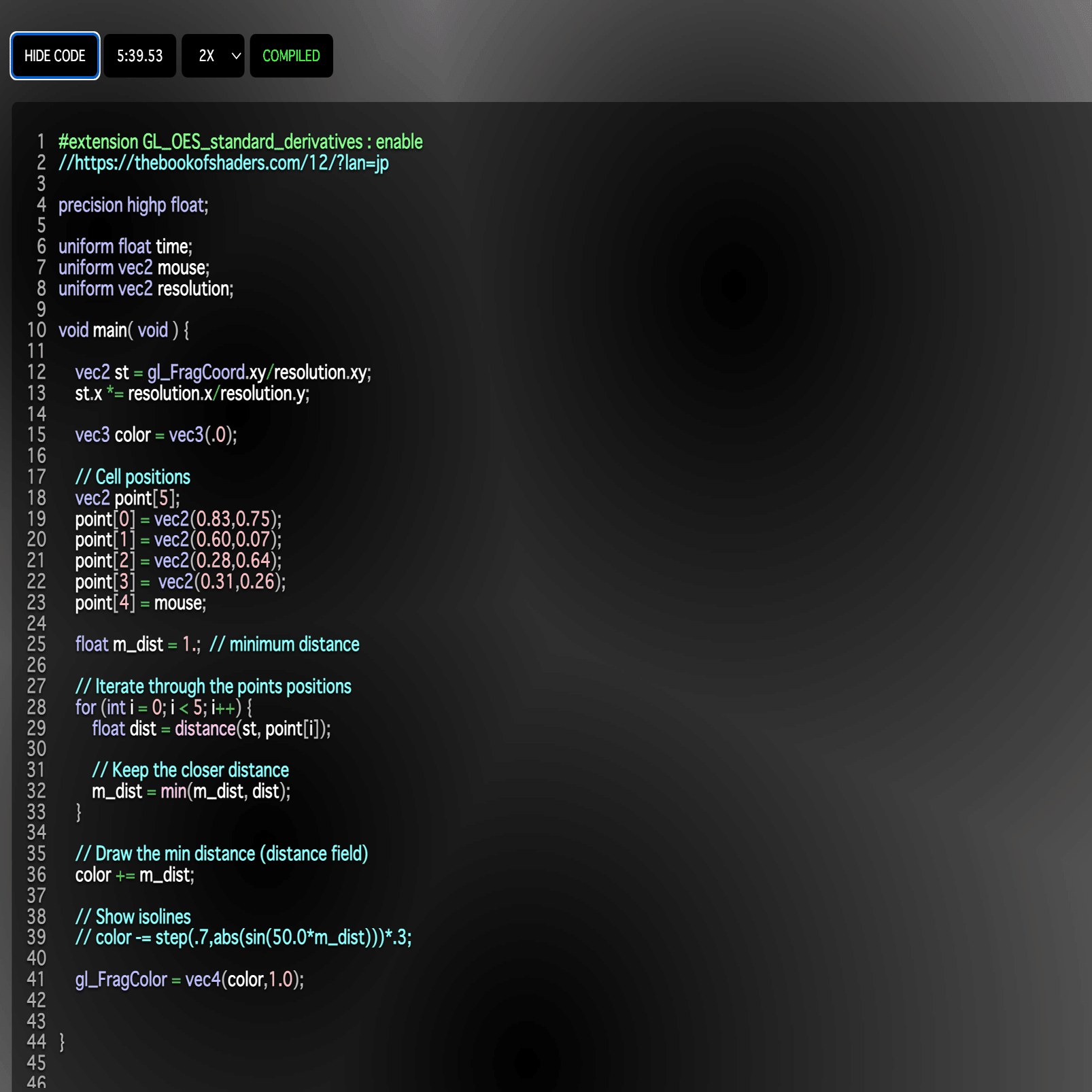 GLSLのコード、距離とって最小とって濃淡付けてというのは同じみたいだが、コードを読んでみても三角形がどうこうというのと直感的につながらない。さて