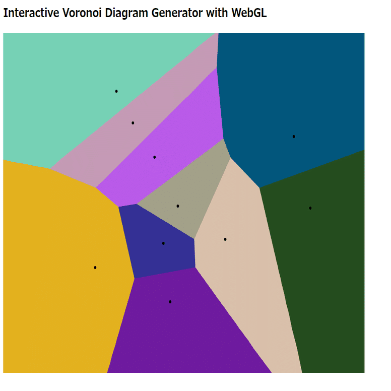 それぞれの領域は多角形として描かれ、隣接する領域の境界は、2つの生成点の中点を結んだ直線になります。